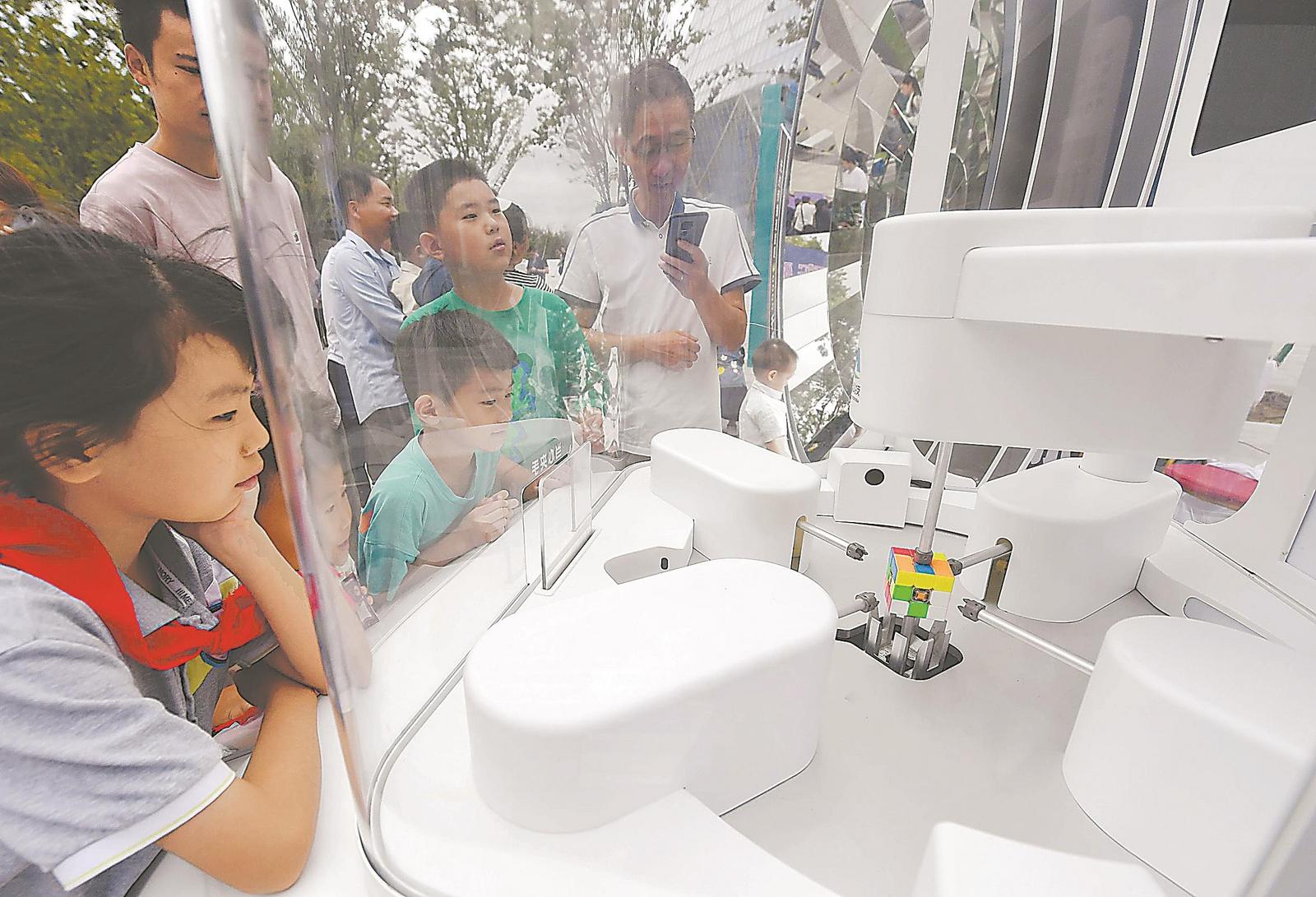 9月21日,孩子们在省科技馆观看机器人玩魔方。当日,2024年全国科普日安徽省暨合肥市主场活动在省科技馆举办,活动主题为“提升全民科学素质,协力建设科技强国”。记者 徐旻昊 摄