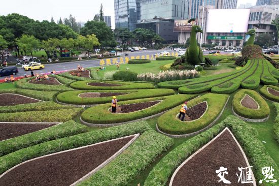 两侧绿地处和西侧的绿地上,工人正在用花盆布置喜庆的图案。(宋宁)