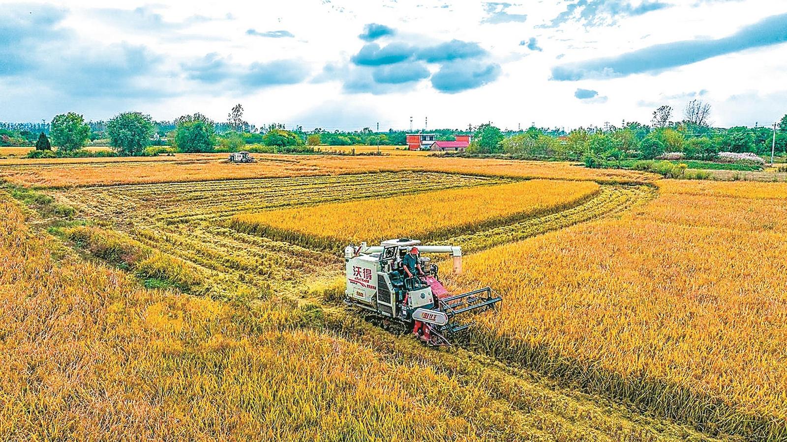 10月16日,种粮大户在肥东县梁园镇花庵村抢收水稻。近年来,肥东县持续推进高标准农田建设,稳步提高粮食综合生产能力,确保粮食安全。通讯员 王尚云 摄