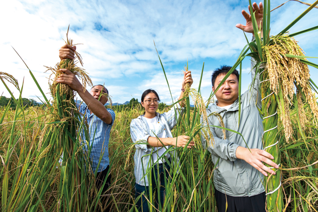 苏南早报网讯 近日,金华兰溪市诸葛镇长乐村稻田里,由金华市农科院引进试种的巨型稻一片金黄,科研人员正在齐人高的稻浪中查看水稻生长情况。