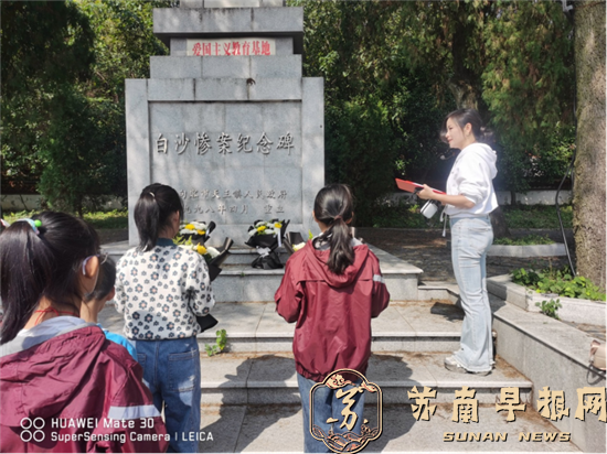 四年级的孩子们第一站来到了白沙村。迎面而来的是一幅葱郁与金黄交织的美景,令同学们“哇”声一片。在导游的带领下,同学们走进村庄,领略了特色田园乡村的魅力,了解了传统的农耕文化。白沙村不仅是乡村振兴的璀璨明珠,更是红色文化的传承者。同学们来到白沙惨案纪念碑下,庄严地缅怀革命先烈。