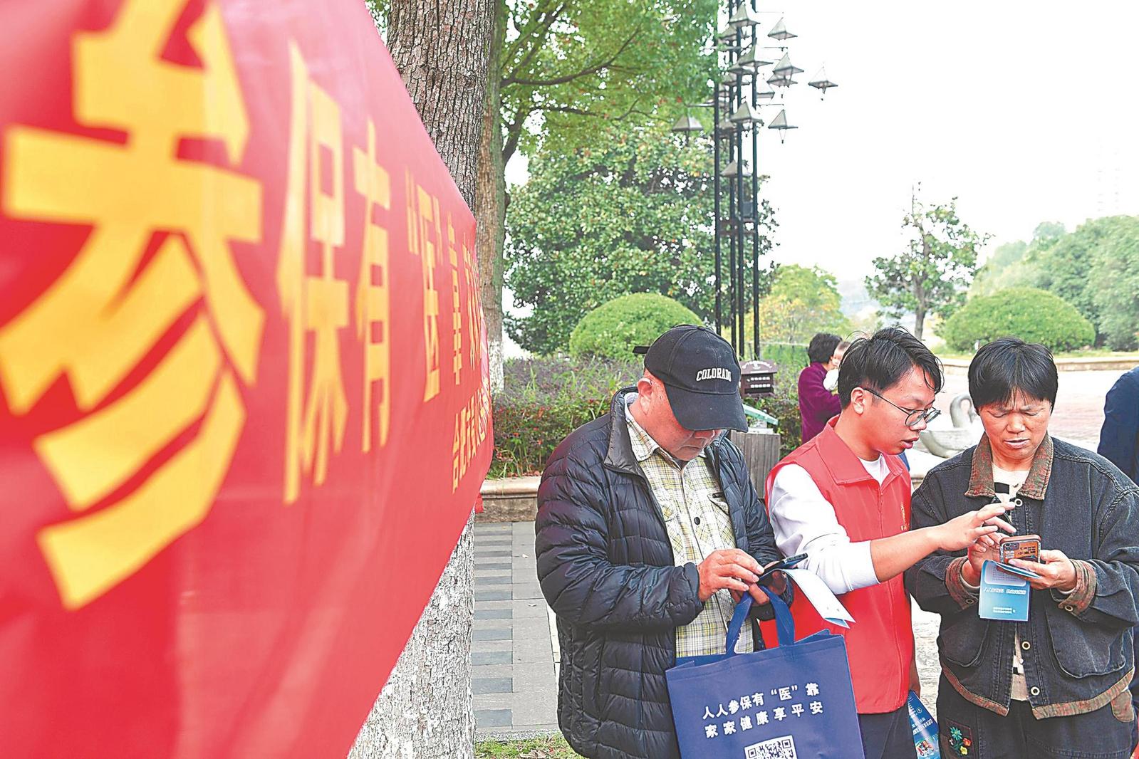 10月28日,在合肥市蜀山区井岗镇蜀山社区新加坡花园城小区,志愿者指导居民在手机上缴纳医保费。 通讯员 程富忠 葛宜年 摄