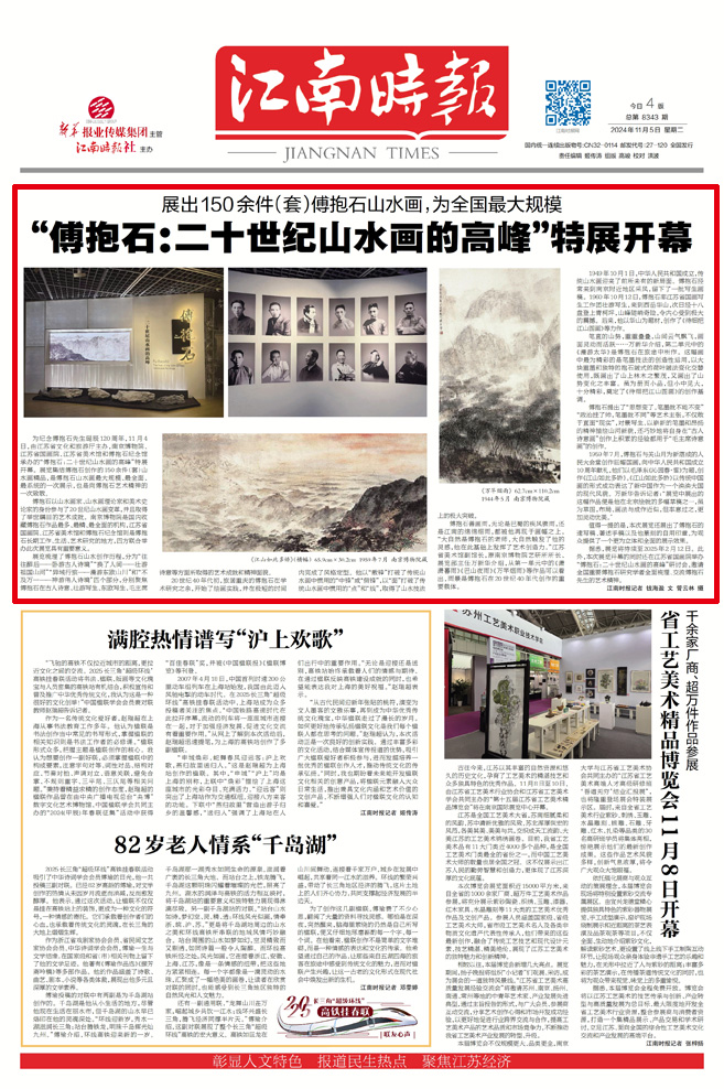 为纪念傅抱石先生诞辰120周年,11月4日,由江苏省文化和旅游厅主办,南京博物院、江苏省国画院、江苏省美术馆和傅抱石纪念馆承办的“傅抱石:二十世纪山水画的高峰”特展开幕。展览集结傅抱石创作的150余件(套)山水画精品,是傅抱石山水画最大规模、最全面、最系统的一次展示,也是向傅抱石艺术精神的一次致敬。