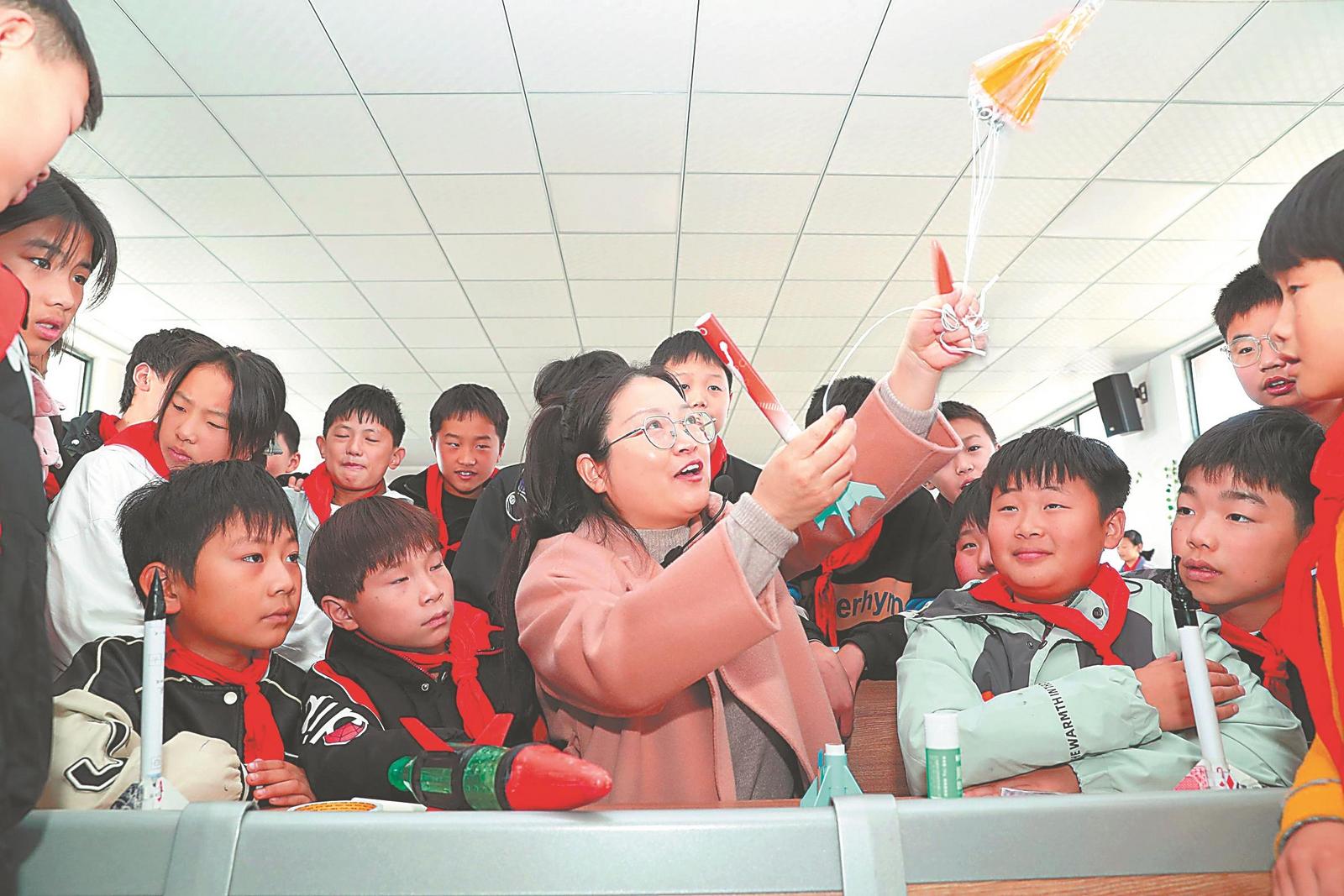 11月7日,由蒙城县科协、县教育局等推出的前沿科技进校园活动走进篱笆镇中心小学,通过科普展览、航天讲座、模拟发射等形式,让学生近距离感受航天科技的神奇。通讯员 胡卫国 摄