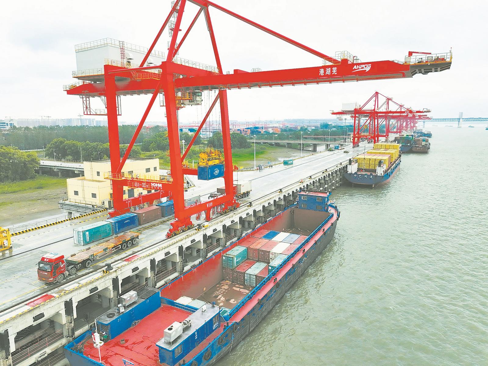 安徽港口集团芜湖港朱家桥国际集装箱码头,集装箱装卸紧张有序。(资料图片)通讯员 王玉实 摄