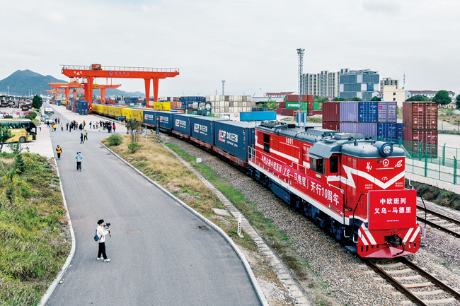 苏南早报网讯 11月18日,满载110个标准箱日用百货、汽车配件、机械设备等出口货物的“义新欧”中欧班列从铁路义乌西站鸣笛启程,驶往逾1.3万公里外的西班牙首都马德里。当天,“义新欧”中欧班列迎来开行10周年节点。(楼冀阳、胡肖飞)