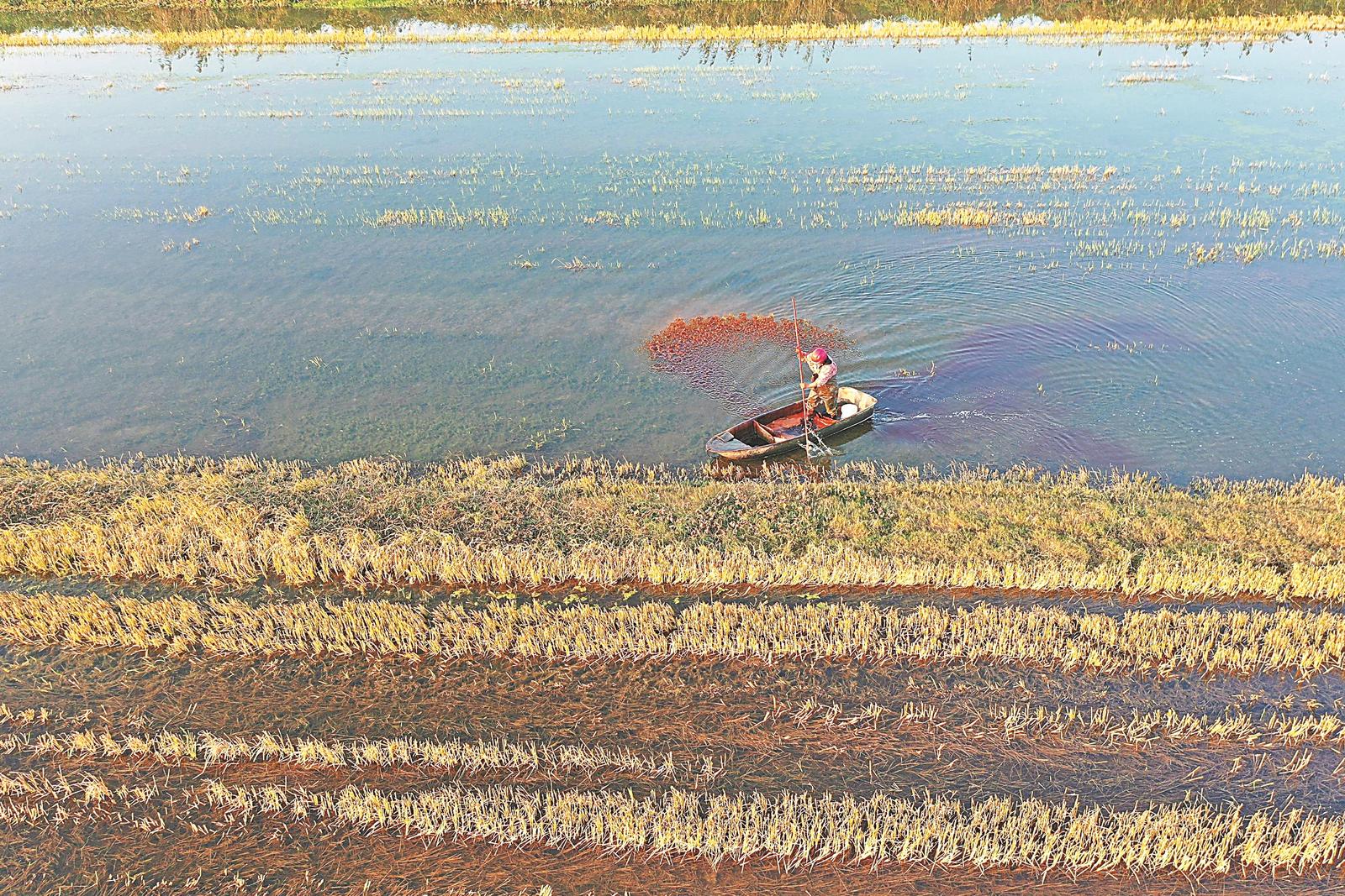 苏南早报网讯 11月21日,位于宿松县的安徽农垦华阳河农场,职工在虾田喂料。小雪节气来临,华阳河农场组织职工进行田管作业,为来年农业增产打牢基础。通讯员 李 龙 摄