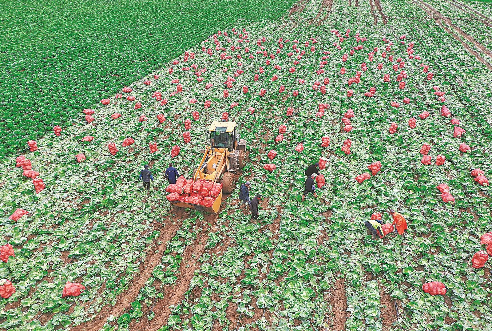 11月20日,蒙城县板桥集镇双鹿村田间,农民在采收甘蓝,准备运往长三角市场销售。通讯员 胡卫国 摄
