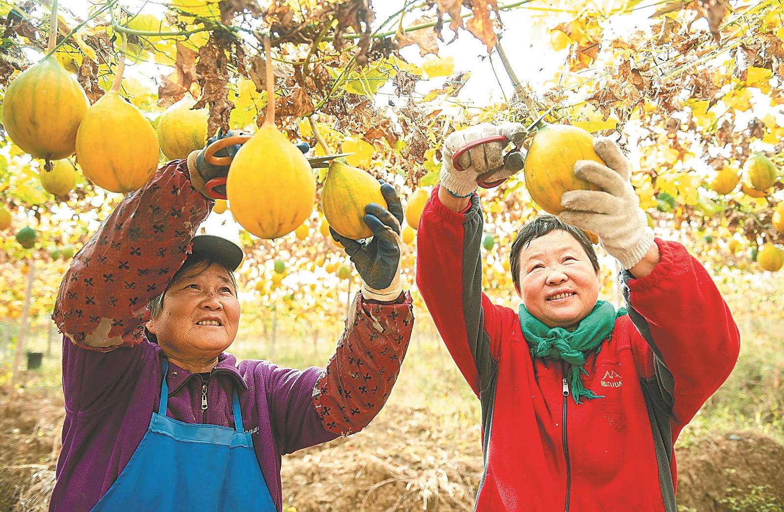 11月21日,含山县陶厂镇司徒村瓜蒌种植基地,村民在采收成熟的瓜蒌。目前,司徒村近百亩瓜蒌迎来收获季,村民抢抓晴好天气采收、晾晒,确保丰产丰收。 通讯员 欧宗涛 过香香 摄