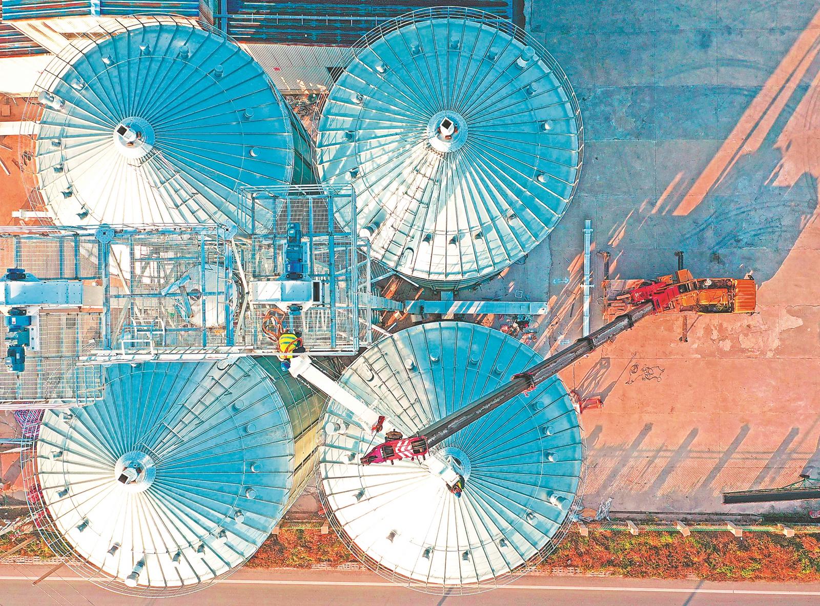苏南早报网讯 12月2日,位于宿松县的安徽农垦华阳河农场农服烘干中心,施工人员在给金属粮仓安装输粮管和加固粮仓。