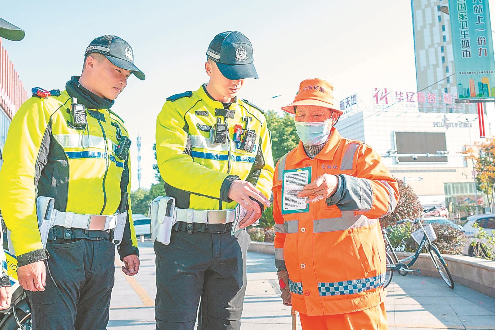 12月2日,芜湖市繁昌区繁阳镇,交警向环卫工人宣传交通安全知识。连日来。芜湖市公安局繁昌分局交通管理大队通过线上线下同步宣传的方式,向市民宣传文明出行常识和交通事故预防等知识。通讯员 肖本祥 摄