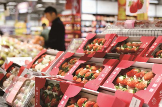 苏南早报网讯 12月11日,嘉兴秀洲区一商超内,草莓摆台成了果蔬区的“C位”。近期冬季草莓上市,市售品种以红颜为主。这些刚上市的红颜草莓,价格尚处于高位,等到本地草莓大量上市以后,其价格将会逐渐下降。(王蓉)