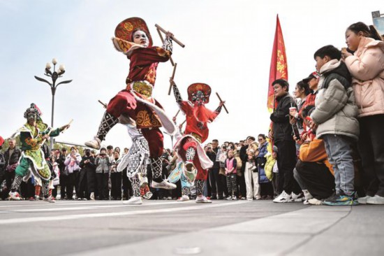 2月16日下午,集戏剧、舞蹈、武术于一体的潮汕英歌舞在嘉兴市区少年路上激情上演,现场里三层外三层挤得水泄不通,不少观众跟着英歌队员的节奏鼓掌呐喊。(王振宇)