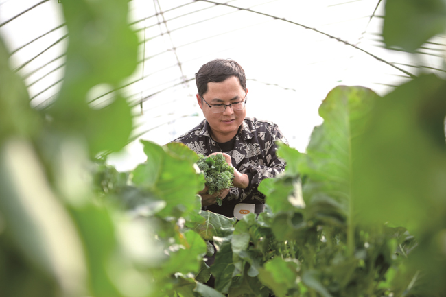 苏南早报网讯 3月6日,在嘉兴市南湖区大桥镇八零后家庭农场里,农场主顾卫军正在采摘西兰苔。据了解,这是嘉兴本地唯一种植西兰苔的农场。