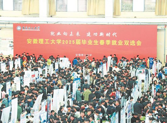 3月22日,在安徽理工大学举办的就业双选会上,2025届毕业生与用人单位展开面对面交流。当日,大会邀请来自全国各地的414家企事业单位,提供1万多个就业岗位。通讯员 代宜喜 摄