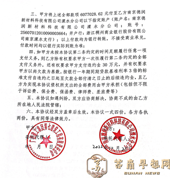 施工工程中,出卖方南京德润新材料科技有限公司溧水分公司严格遵守《合同》约定,不折不扣保质保量按期交货,且出具双方均认可的销售明细清单和对账单。至2021年7月,甲方欠乙方货款6077028.62元逾期未依约付款,乙方将甲方诉至南宁市良庆区人民法院(案号:(2022)桂0108民初9051号)。