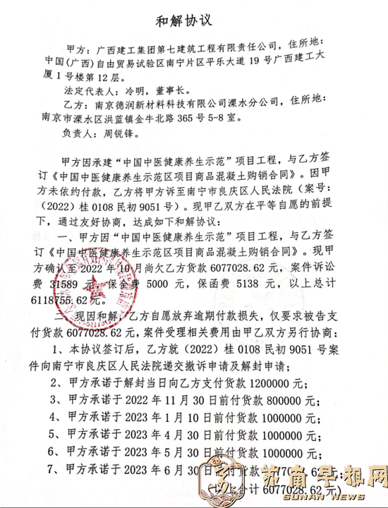 2021年1月25日,广西建工集团第七建筑工程有限责任公司作为买受方和出卖方南京德润新材料科技有限公司溧水分公司,签订了《中国中医健康养生示范区项目商品混凝土购销合同》。《合同》在合同标的物、质量标准、交货方式及时间、货物数量及质量的验收、付款方式和时间、税票要求、违约责任、争议解决及其他等方面具体约定。
