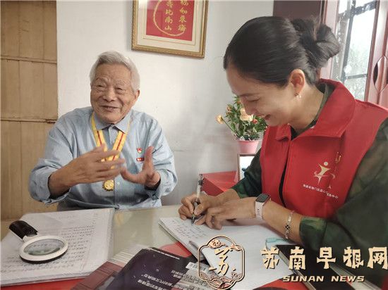 苏南早报讯 8月5日上午,南通市通州区平潮镇吉坝乡连爱心协会的志愿者们,走进崇川区易家桥新村,看望慰问100岁高龄的抗战老兵许胜,在聆听烽火故事中重温峥嵘岁月,于交流互动间接续初心力量。