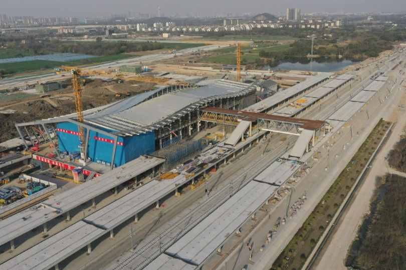 图为建设中的沪苏湖铁路湖州东站站房及站台。新华社记者 黄宗治 摄