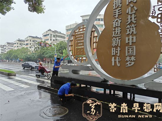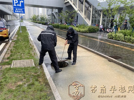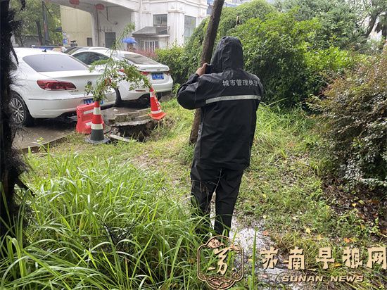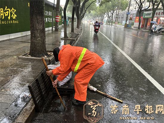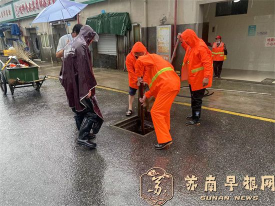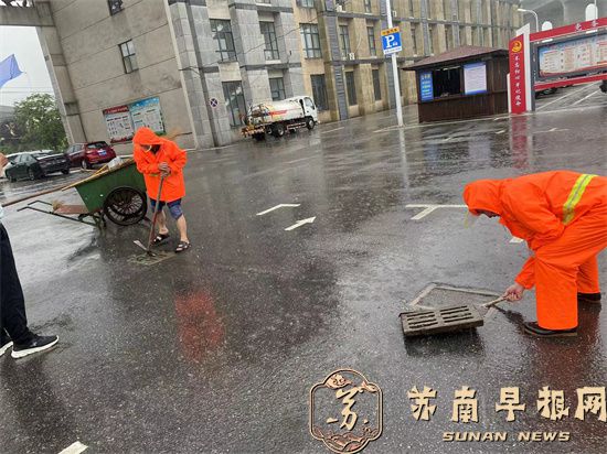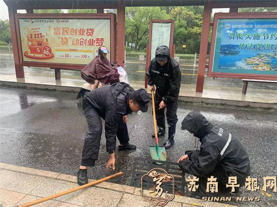 一大早,句容市城市管理综合行政执法大队立即派出100多名应急队员冒雨出动,仔细做好小区地库、公园广场、地下停车场、菜场等低洼易涝地区的防守管控,迅速清理堵塞道路下水道及雨箅的杂物,确保排水通畅。
