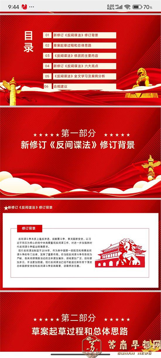 苏南早报讯 反间谍法培训旨在提高全体员工及特定群体的国家安全意识,增强对间谍活动的识别和防范能力,确保国家安全和社会稳定。通过培训,使参与者了解反间谍法的基本内容、间谍活动的常见形式、防范间谍活动的方法和技巧,以及遇到间谍活动时的应对措施。