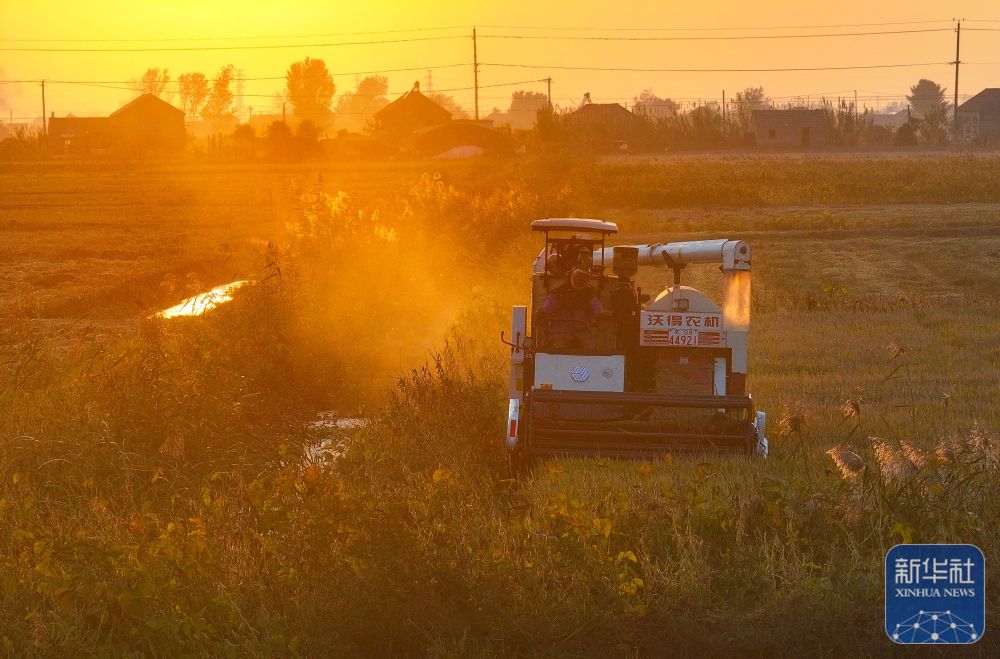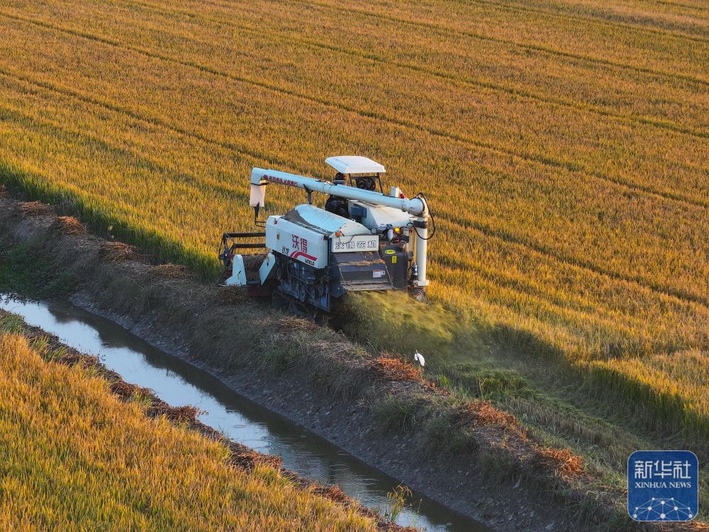 在射阳县海河镇巨星村,收割机在田间收割水稻。(10月29日摄,无人机照片)
