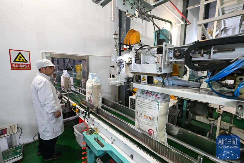 在江苏射阳大米集团有限公司自动化生产车间,一袋袋射阳大米完成包装。(10月29日摄)