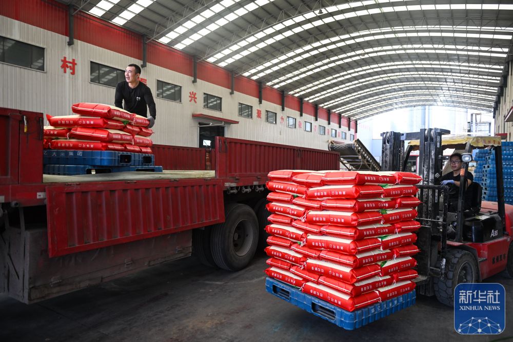在位于射阳县的江苏必新大米集团,工人往卡车上装运射阳大米。(10月30日摄)