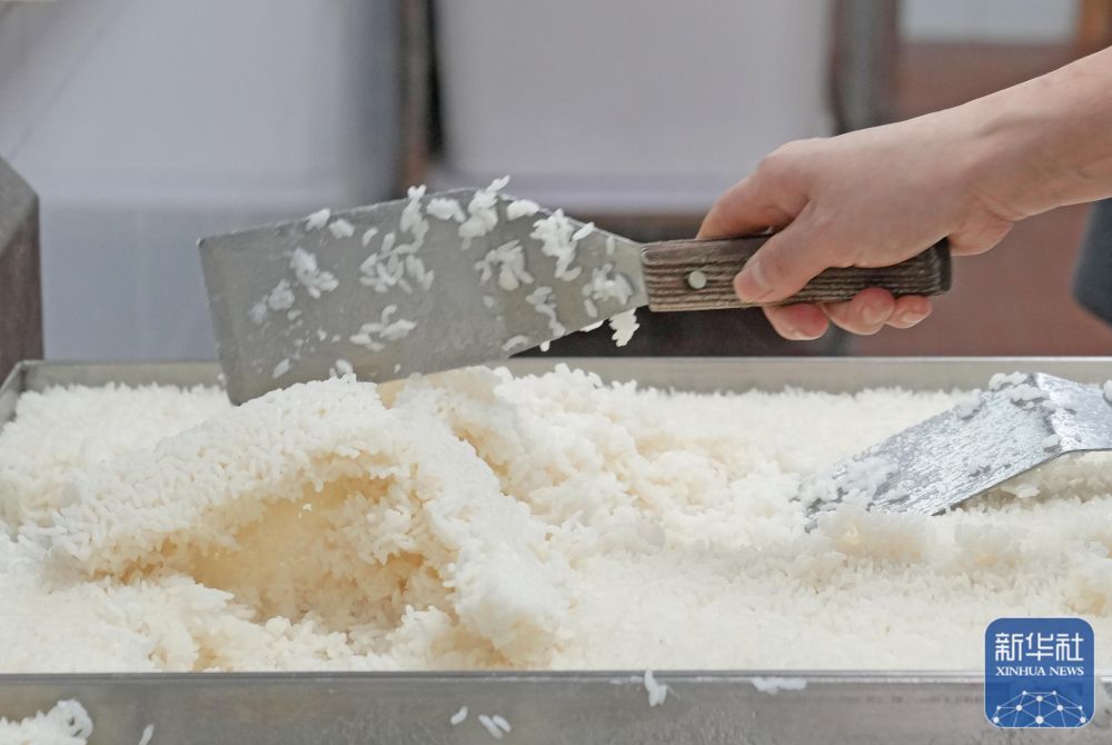 11月11日,在位于上海静安区的一家单位食堂内,餐厨人员在切分用射阳大米蒸制的米饭。