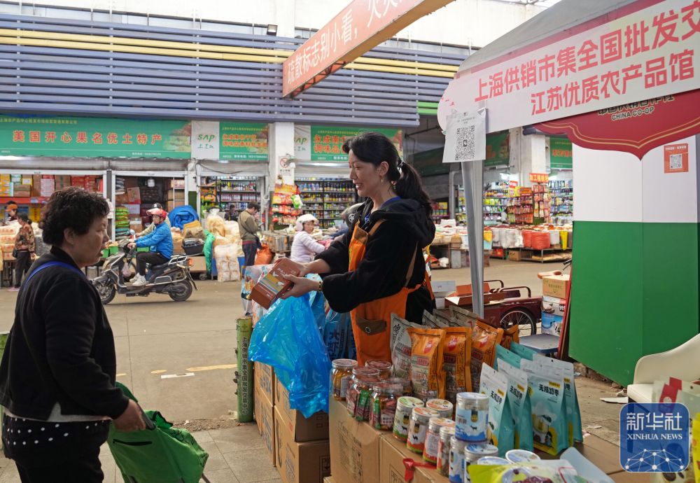 位于上海农产品中心批发市场的上海供销市集江苏优质农产品馆外,工作人员向顾客推荐优质射阳大米(11月11日摄)。