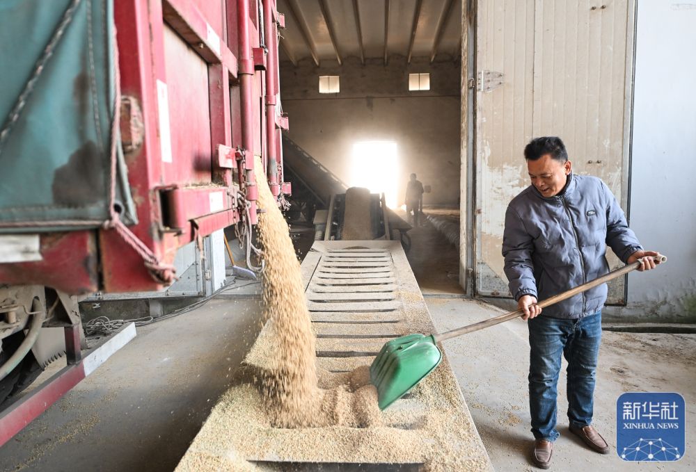 在位于射阳县的江苏必新大米集团,运粮车卸粮入库(10月30日摄)。