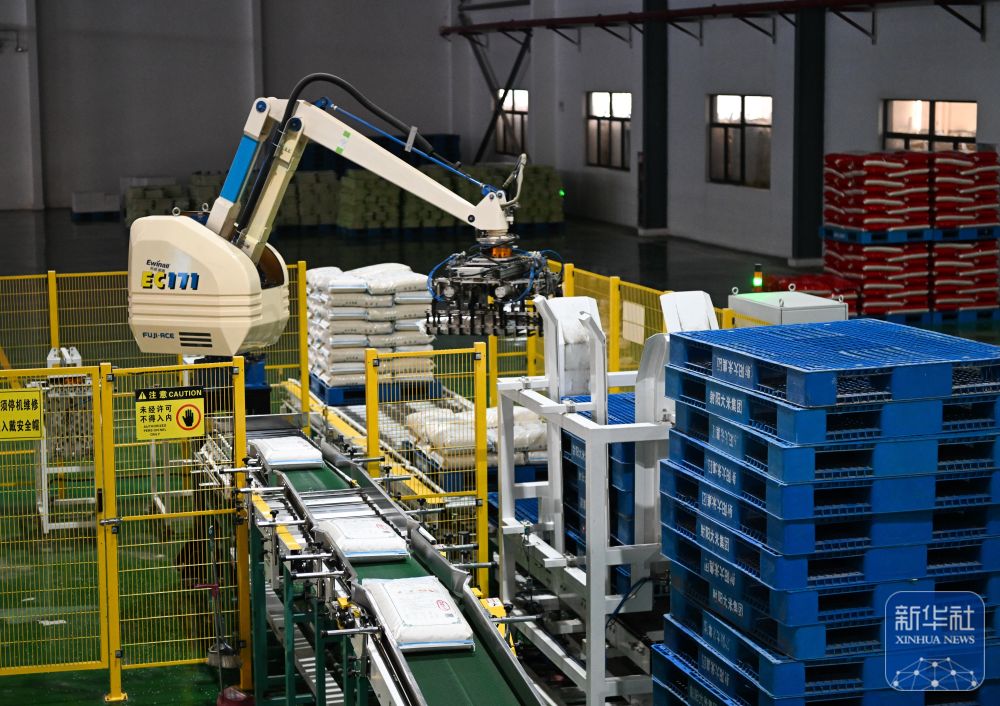 在江苏射阳大米集团有限公司自动化生产车间,机械臂在搬运大米(10月29日摄)。