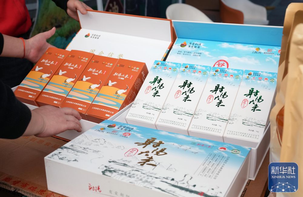 位于上海农产品中心批发市场的上海供销市集江苏优质农产品馆中展示的优质射阳大米礼盒(11月11日摄)。