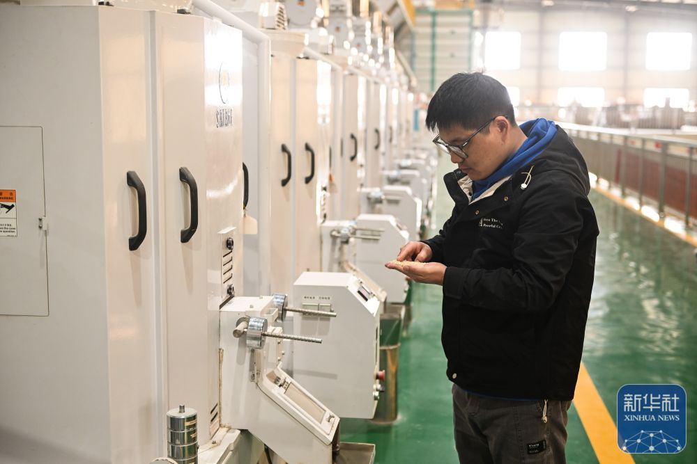 在位于射阳县的江苏必新大米集团,工人在检查机器碾米情况。(10月30日摄)