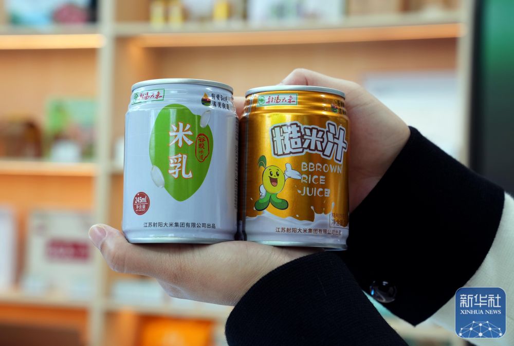 位于上海农产品中心批发市场的上海供销市集江苏优质农产品馆中,工作人员展示用射阳大米加工制成的饮料。(11月11日摄)