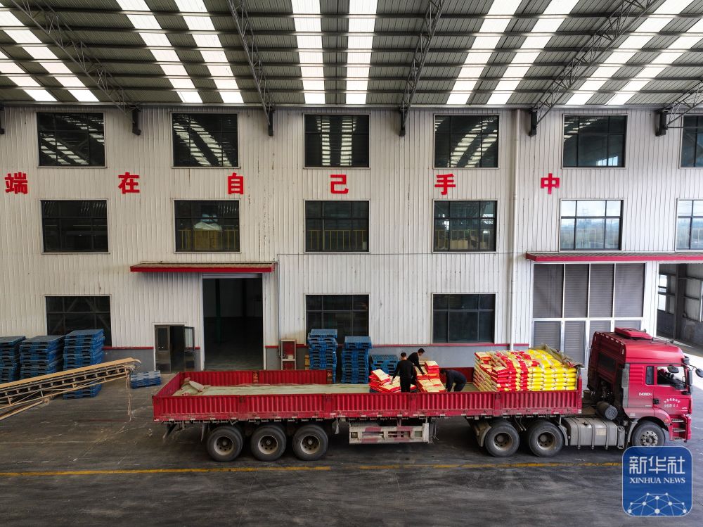 在位于射阳县的江苏必新大米集团,工人往卡车上装运射阳大米。(10月30日摄,无人机照片)