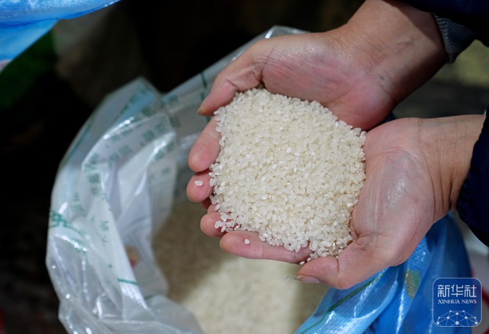 在上海市京江路上的秀莲食品店,店主在展示店内售卖的射阳大米。(11月11日摄)