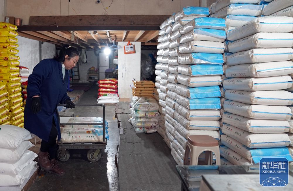 在上海市京江路上的秀莲食品店,店主在搬运射阳大米。(11月11日摄)