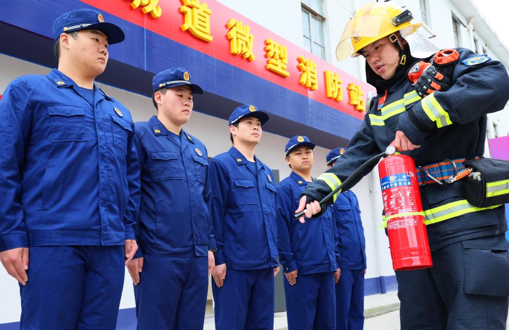 11月18日,一位消防员(右)在向微型消防站队员分享灭火器的使用技巧。