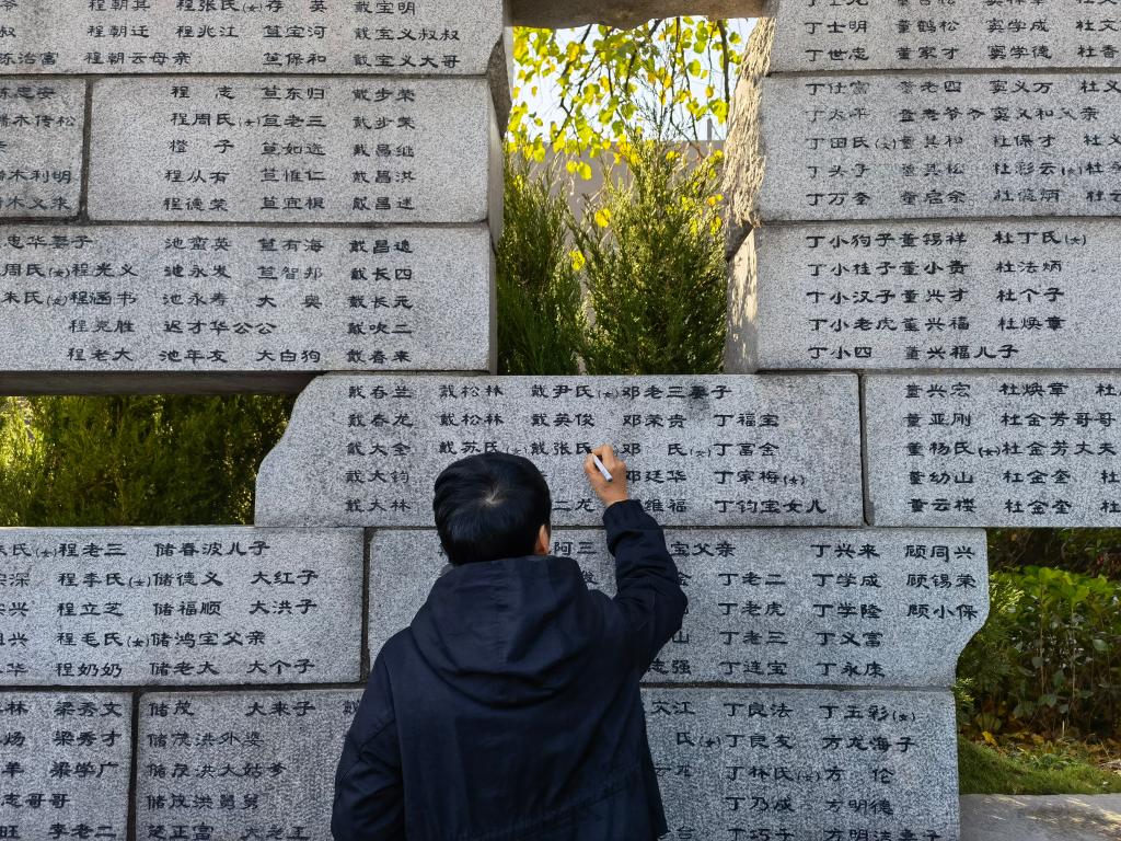 已故南京大屠杀幸存者常志强的女儿常小梅为“哭墙”上家人的姓名“描新”。 新华社记者 邱冰清 摄1937年12月13日,常志强目睹6位亲人丧生在日军刀枪之下。2022年,常小梅成为首批“南京大屠杀历史记忆传承人”。她写作并出版了中、日、英文版的《南京大屠杀幸存者常志强的生活史》,“希望用我的微薄之力,让更多人了解并记住这段历史,明白和平的可贵,珍视当下的幸福。”她说。