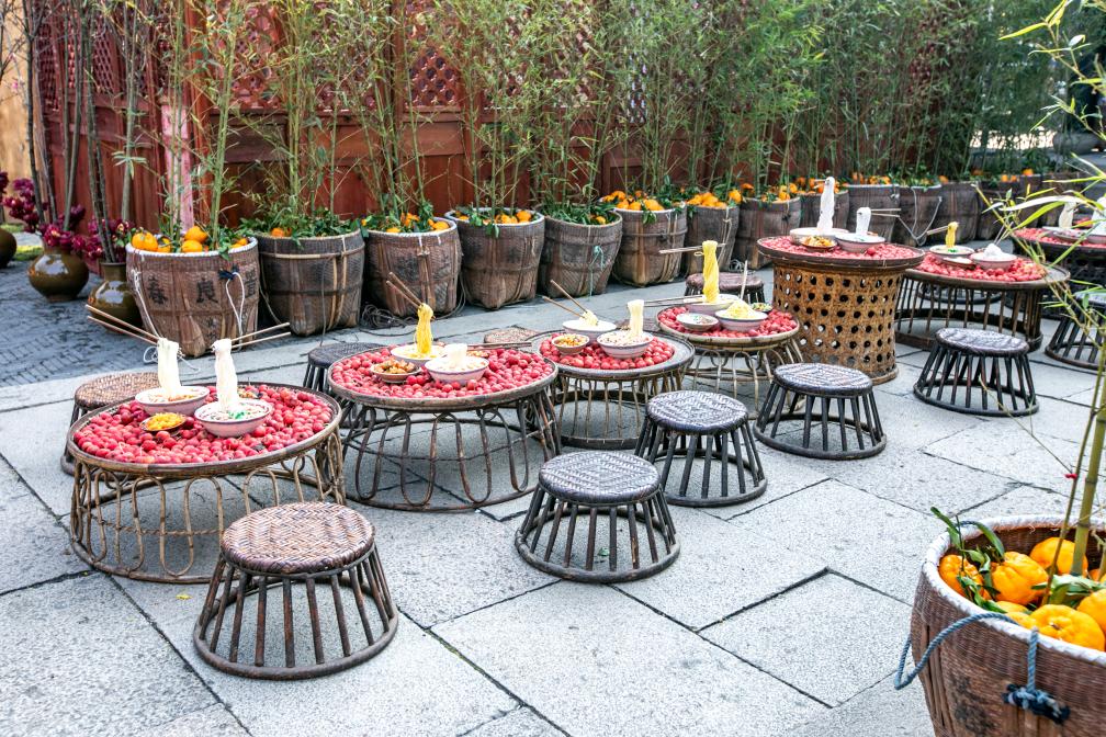 展览将民间窗棂之美与传统园冶手法相结合,以赏席的形式呈现,让观众沉浸式感受旧时年节的热闹与欢快。四大主题区域空间的设计,以四季为主题,主桌以瓦片为设计元素,间以麦子、梅花和青苔点缀,不仅展现了东方的美学智慧,更体现乡土生活中蕴含的勤劳与朴实的品质,用家乡味唤起观众的乡愁。
