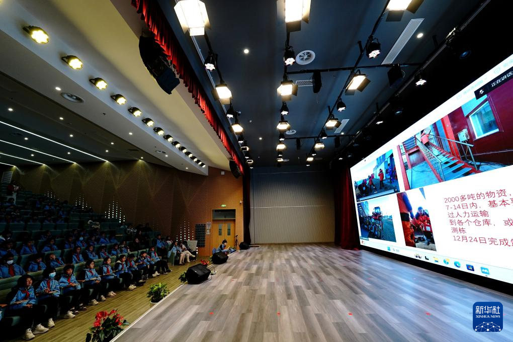 2月17日,上海师范大学附属奉贤实验中学举行“雪龙探秘新征程 海韵逐梦共扬帆”活动。这是学生们与中国第41次南极考察队队员进行视频连线。