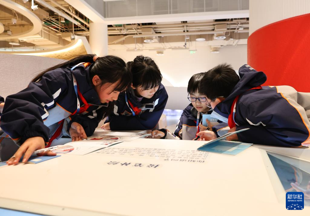 2月17日,在上海博物馆东馆,同济大学附属澄衷中学的学生在古书画修复技艺展台前体验电子版模拟接笔补绘技术。