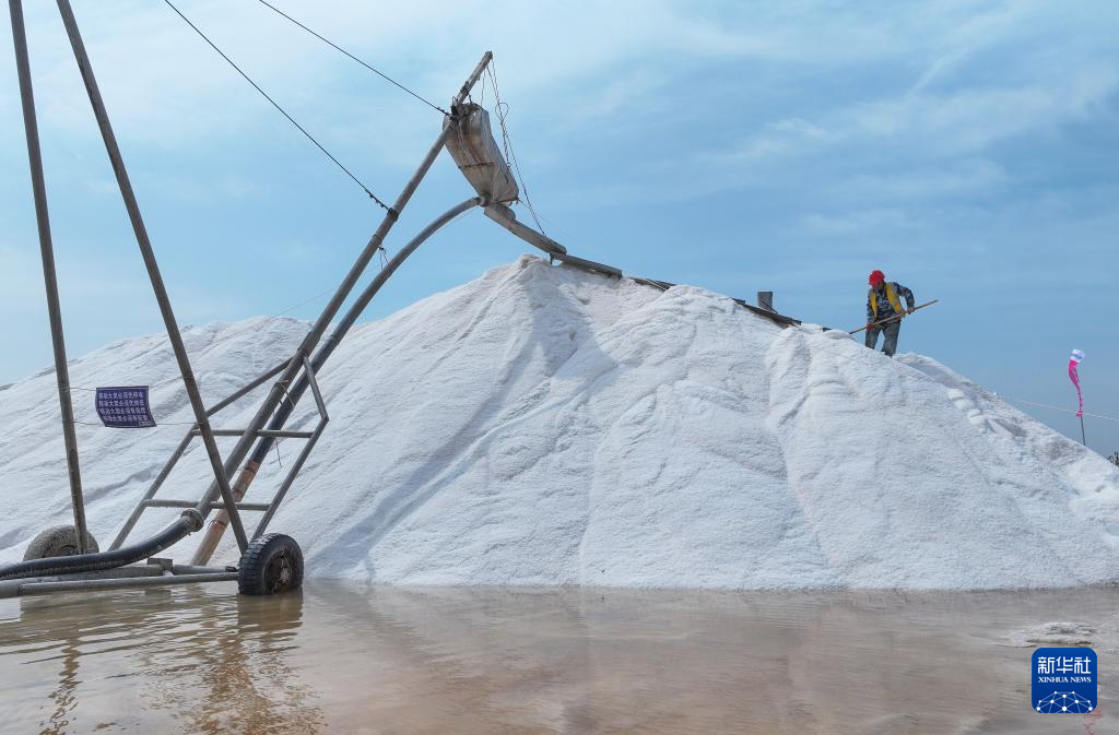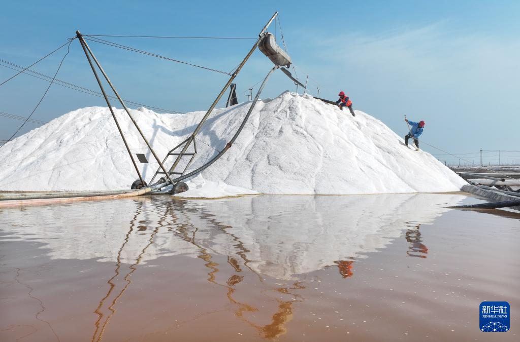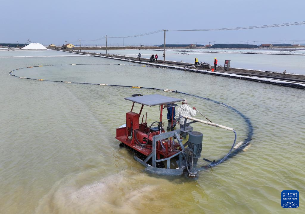 连日来,在江苏省连云港市灌西盐场1.5万亩盐田上,工人们抢抓晴好天气,加紧进行春季扒盐作业。