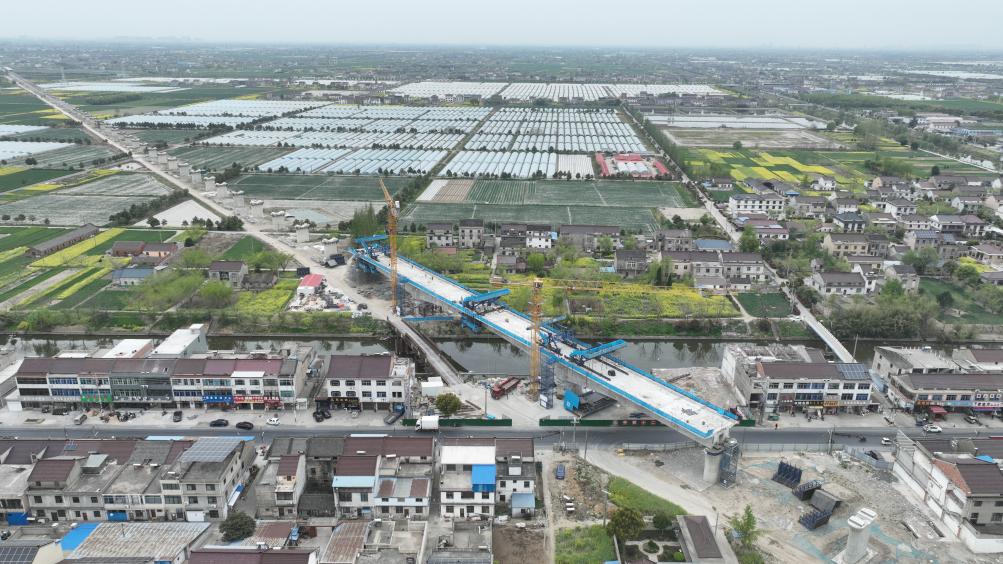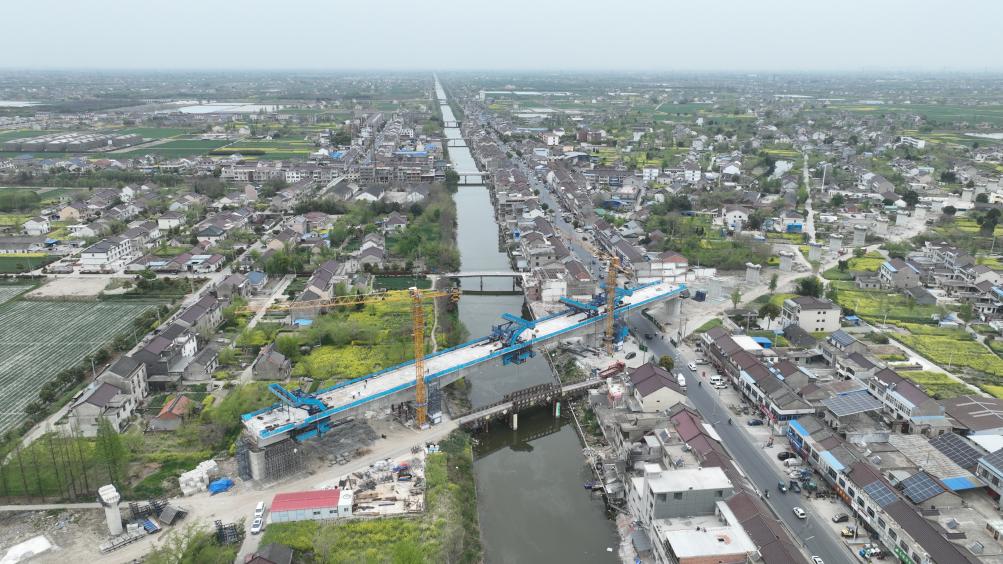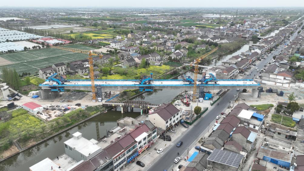 这是用无人机拍摄的沪渝蓉高铁泰州段通泰扬特大桥跨宣堡港连续梁施工现场。