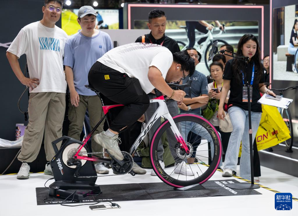 5月5日,在上海新国际博览中心举行的2025中国国际自行车展览会上,一名男子在体验自行车竞速游戏。