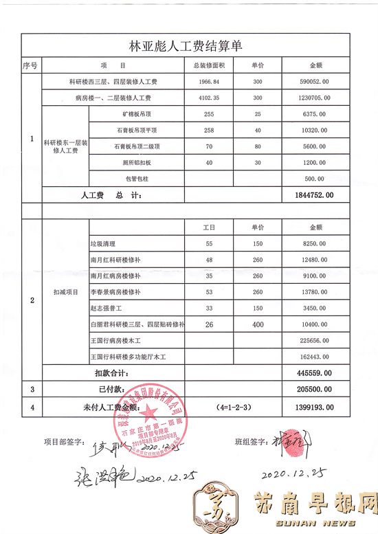 石家庄市第一医院石家庄裕华区南大街与裕泰路交汇处365号(赵卜口院区),是石家庄政府投资项目,建设单位为石家庄市政府投资项目代建中心,施工总承包单位为河北建工集团有限责任公司(简称河北建工)。2019年9月,深装总建设集团股份有限公司(简称深装总建)分包河北省石家庄市第一医院门诊楼施工项目,林亚彪班组48人负责石家庄第一医院(赵卜口院区)科研楼西三层、四层及病房楼一层、二层装修工程施工任务。蹊跷的是,该工程于2020年6月30日前完结,建筑主体随即投入使用,而直到同年12月25日才给林亚彪班组出具“人工费结算单”。