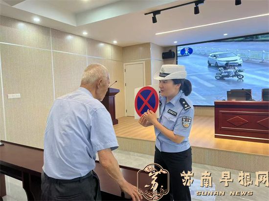 “这是什么交通标识”?”这是慢行标识。”交警用日常简单的交通标识让老人们辩识。