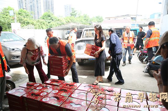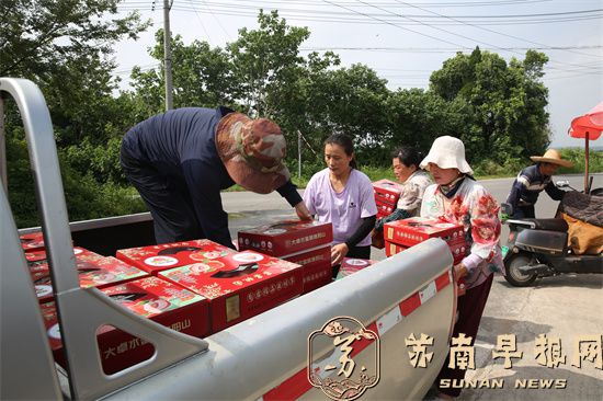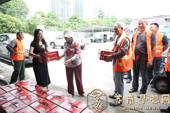 苏南早报讯 2025年7月11日上午,句容市大卓果果桃园女主人王玉琴一大早就组织6名员工,钻进桃园里,采摘新鲜水蜜桃,然后,选桃、包装、装箱,把包装成箱的110箱鲜桃搬运至小车上,运送到句容市环卫处华阳中转站,向环卫工人表达果农的一片爱心。
