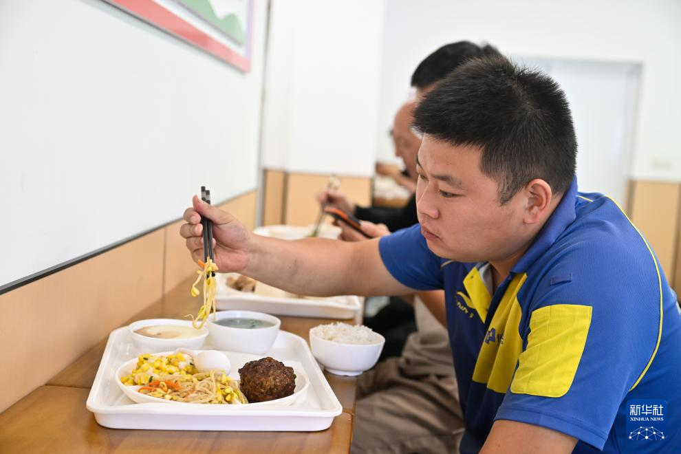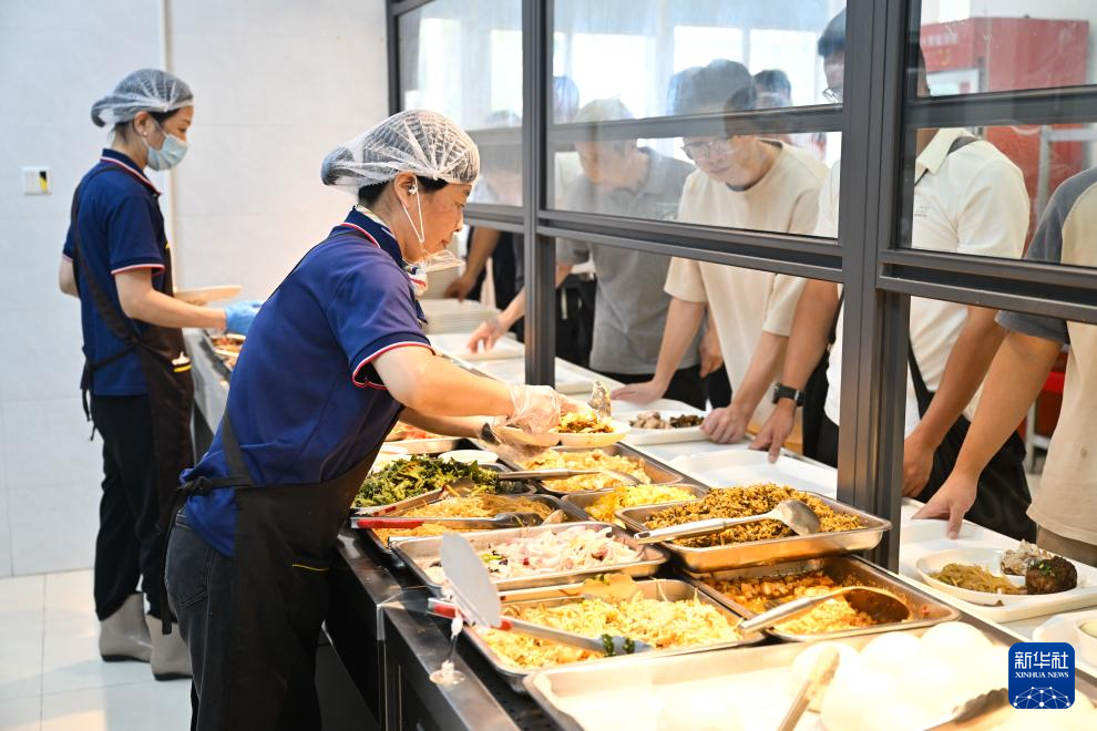 9月22日,在小米行大食堂,工作人员为顾客打饭菜。